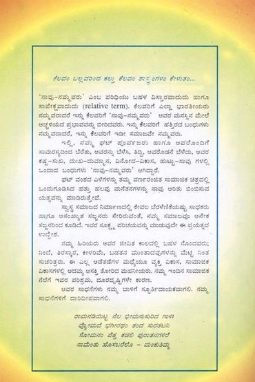 Abhisheka was published in commemoration of the Kanabhisheka utsava of Smt. Sarojamma in February 2002.
